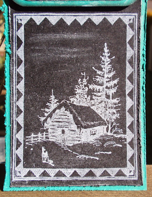 For the cottage scene, I masked off the edges with tape before inking with clear embossing ink to fit inside the frame.
